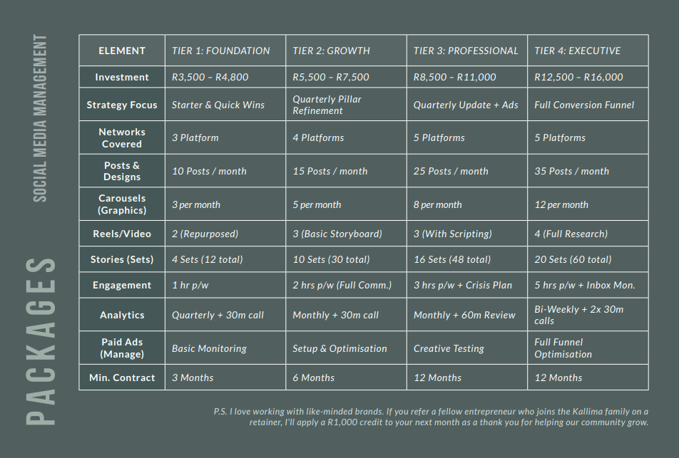 P.S. I love working with like-minded brands. If you refer a fellow entrepreneur who joins the Kallima family on a retainer, I’ll apply a R1,000 credit to your next month as a thank you for helping our community grow.