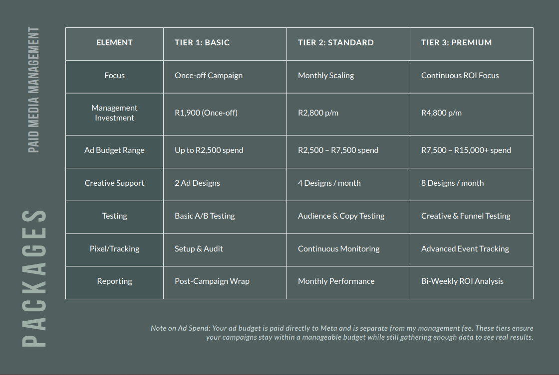 Note on Ad Spend: Your ad budget is paid directly to Meta and is separate from my management fee. These tiers ensure your campaigns stay within a manageable budget while still gathering enough data to see real results.