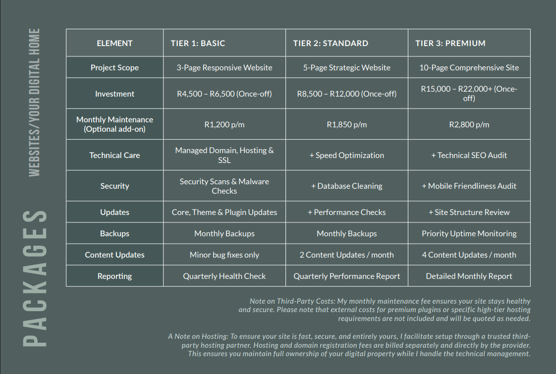 Note on Third-Party Costs: My monthly maintenance fee ensures your site stays healthy and secure. Please note that external costs for premium plugins or specific high-tier hosting requirements are not included and will be quoted as needed.