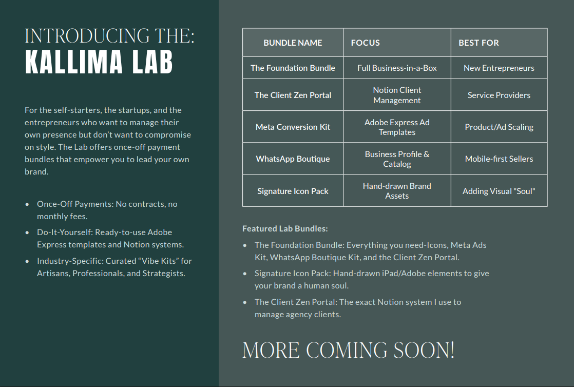 The Foundation Bundle: Everything you need – Icons, Meta Ads Kit, WhatsApp Boutique Kit, and the Client Zen Portal.
