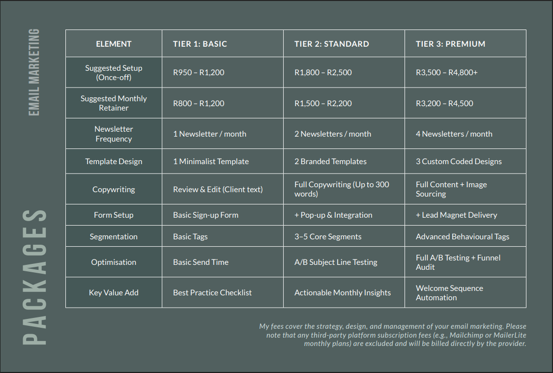 My fees cover the strategy, design, and management of your email marketing. Please note that any third-party platform subscription fees (e.g., Mailchimp or MailerLite monthly plans) are excluded and will be billed directly by the provider.